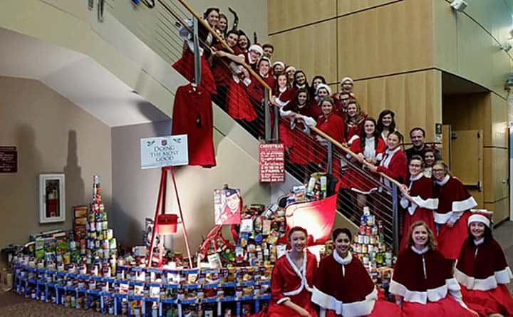 The “Fill the Sleigh” campaign conducted at Fond du Lac High School and before the White Christmas performances on November 6 – 9 brought in over 5,000 food items and $300+ to be donated to the Salvation Army. Fond du Lac High School’s first hour classes donated 1,412 food items and just over $300.  The middle schools and audience members for the show donated the balance of food items. Shown here after the final performance is the White Christmas cast around the sleigh with the items that will be delivered to the Salvation Army courtesy of the Fond du Lac School District’s facility services staff.