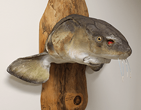 An exhibition featuring sturgeon artwork, artifacts, and history.
