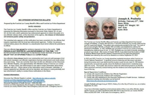 The Fond du Lac County Sheriff’s Office and Fond du Lac Police are notifying the public that a convicted violent child sex offender is being released from custody.  Fifty nine year old Joseph Prellwitz is scheduled to be placed on supervised release this Friday.  He will be living at 1830 South Hickory Street…near the county Highway Garage.  In 1985 Prellwitz was convicted of sexually assaulting an 11 year old girl.  Seven years later he was convicted and spent time in prison for sexually assaulting two relatives.