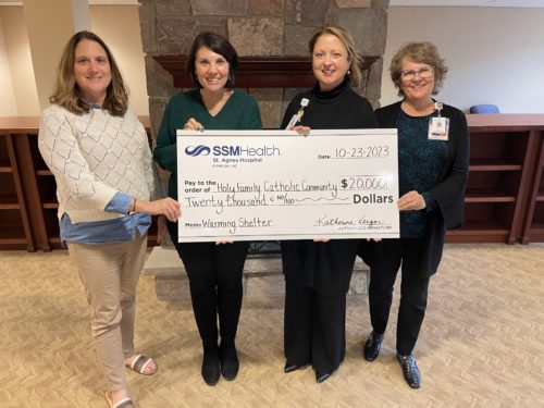 Photo caption: Katherine Vergos (second from right), president of SSM Health St. Agnes Hospital and Dawn Vandenberg (far right), SSM Health Regional Director – Mission Integration, presents a $20,000 gift to support the new Holy Family Warming Shelter. The donation was received by Michelle Ludtke (left), director of Operations with Holy Family Catholic Community, and Erin Cobb, director of Human Concerns, Holy Family Catholic Community.
