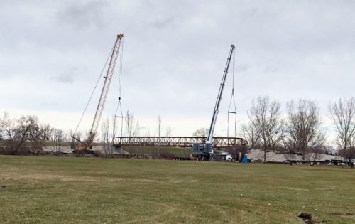 Work has resumed on a bridge connecting Fond du Lac’s Lakeside Park with Lakeside Park West.    Large cranes lifted the bridge and placed the structure on the bridge abutment Monday morning.  Fond du Lac Advisory Park Board member John Papenheim says the bridge will make it easier for residents to access Lakeside Park West.  “I am really excited about it,”  Papenheim told WFDL news.  “Lakeside Park West is so underused and it has been underused for years.  Its a beautiful place.”   Work on the project started last year erosion control, grading and embankment fill.   The project is scheduled for completion by the middle to end of May.