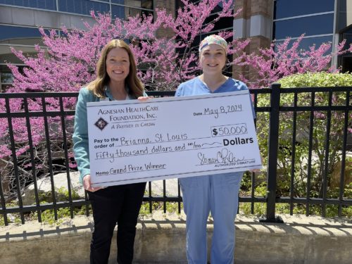 photo: Shawn Fisher (left), Agnesian HealthCare Foundation executive director, presents the Samaritan Cash Raffle grand prize to Brianna St. Louis, a Fond du Lac resident.