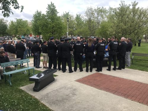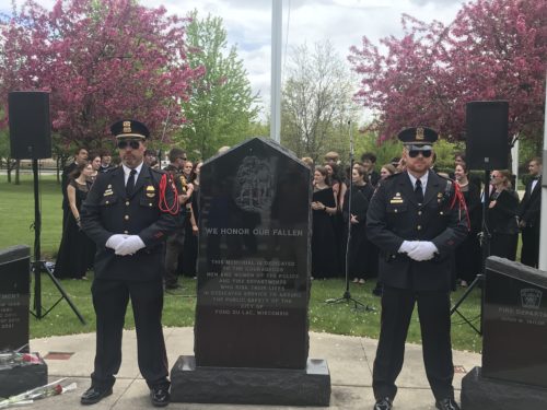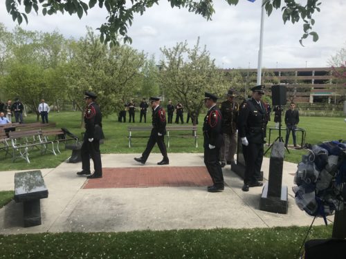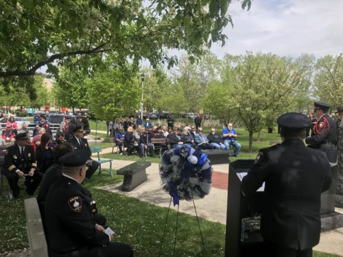 Local law enforcement officers, firefighters and Fond du Lac area residents  gathered  at Hamilton Park in downtown Fond du Lac Thursday afternoon  to remember officers who have given their lives to protect the community.  “I’m grateful we have come together to show that we will never forget,”  Fond du Lac Police chief Aaron Goldstein said.  “This afternoon is a moment in time that we can focus on our undying commitment to honor and remember are fallen and the sacrifices they made.”  During the ceremony officers gathered in a circle around the families of the fallen officers to show their respect and support.  Goldstein  says in the city’s history, five Fond du Lac law enforcement officers have died in the line of duty.  Officer William Prinslow, in 1898, officer Nick Klaske in 1961 and officer Craig Birkholz in March 2011.  State trooper Trevor Casper was shot and killed in Fond du Lac on March 24, 2015 while attempting to apprehend a bank robbery and murder suspect.  Officer Joseph Kurer died in the line of duty from COVID-19 in September 2021.   The Fond du lac Police Department hosted  a memorial ceremony Thursday afternoon at the  Police-Fire Memorial in Hamilton Park.