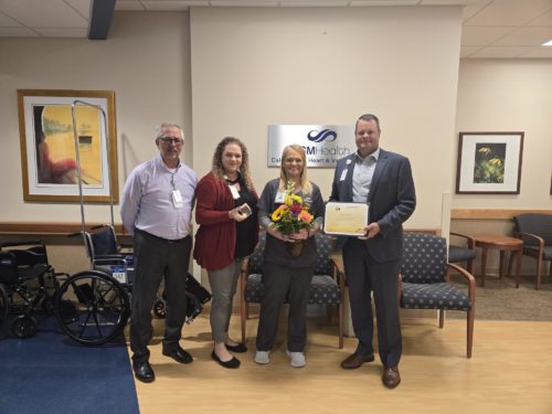 Photo caption: Gretchen Hofman (center), an SSM Health Fond du Lac Regional Clinic Cardiology certified medical assistant, receives recognition as the newest recipient of the BEE (Be Exceptional Everyday) Award by leaders Mark Decker (left), Maria Feucht, and Shane Smith.