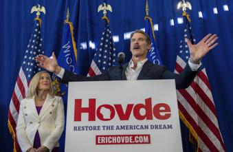 FILE – Eric Hovde, a Republican businessman and real estate mogul launched, announces he is running for U.S. Senate against Wisconsin Democratic incumbent Sen. Tammy Baldwin, Feb. 20, 2024, in Madison, Wis. (Mark Hoffman=wimil