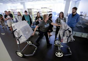A Madison Clerk’s Office worker delivers a pair of additional polling booths past people waiting to vote on the first day of Wisconsin’s in-person absentee voting at the Madison Public Library in Madison, Wisc., Tuesday, Oct. 22, 2024. (AP Photo/John Hart, Wisconsin State Journal)