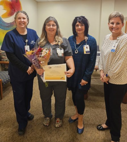 “I have had the pleasure of working alongside Tracy for approximately the last 10 years. Throughout that time, she has consistently performed her duties at a high level. Tracy is the kind of individual who willing embraces any task asked of her and will put patient care as a top priority no matter how bush she may be with her other tasks. She embraces the opportunity to train new staff members, as well as being a dependable resource for other units. Her consistent work ethic, not a single experience, makes Tracy notable to be recognized for her excellent attitude and truly living the mission.” Another nomination shared: “Tracy is always a welcoming presence at the desk for anyone coming onto the unit. Tracy fields many calls throughout the day from those on other units looking for her expertise and knowledge. Tracy is one of the best team members I have ever had the privilege of working with. Besides her role at the desk, she continues to provide excellent care to our patients. She always has a smile on her face and a joke for patients to make them laugh.” The BEE Award is specifically designed to recognize non-nursing staff members who demonstrate great teamwork and communication skills, collaboration, professionalism, exemplary service, and a commitment to excellence.