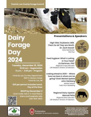 Join your regional Extension Team and the Fond du Lac Forage Council for the annual Dairy Forage Day! Learn more about adding high oleic soybeans to lactating cow diets. Think about Feed Hygiene and how in-field decisions can reduce mycotoxin challenges. Find out what awaits us in 2025 with a look at grain markets and the factors influencing prices. Meet our new dairy educator Manuel Pena and see what the Extension Dairy program is working on.