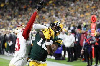 Green Bay Packers wide receiver Malik Heath (18) catches a touchdown pass against San Francisco 49ers cornerback Rock Ya-Sin (33) during the second half of an NFL football game on Sunday, Nov. 24, 2024 in Green Bay, Wis. (AP Photo/Mike Roemer)