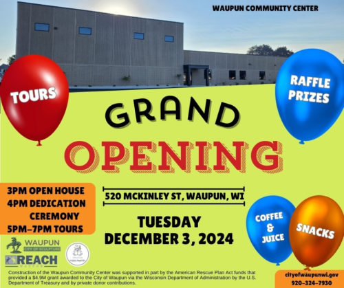 Tuesday afternoon: All are invited to the official grand opening of Waupun’s new Community Center located at 520 McKinley Street. The open house begins at 3:00 P.M., with a ribbon cutting ceremony at 4:00 P.M. Tours, snacks, and raffle prizes will be available. See the image below for more details.