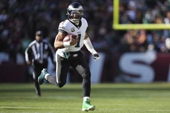 Philadelphia Eagles quarterback Jalen Hurts (1) running with the ball during the first half of an NFL football game against the Washington Commanders, Sunday, Dec. 22, 2024, in Landover, Md. (AP Photo/Stephanie Scarbrough)