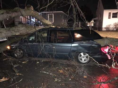 Strong winds knocked down tree limbs throughout the Fond du Lac area Friday night, including this large tree branch that landed on a vehicle on 11th Street in the city of Fond du Lac.  Nobody was hurt.